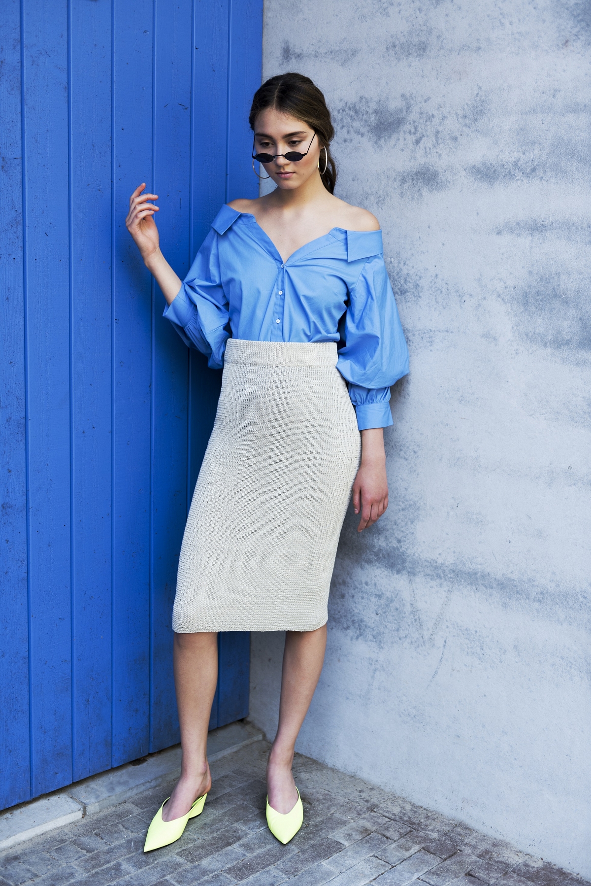 ….We have this skirt that is the perfect start for a great outfit. Neutrals colors can be complemented with any color. Pick a pretty blouse, like this one off shoulders, which is so trendy right now. Or choose an old blouse from your wardrobe. Add some pretty shoes and you are all set.