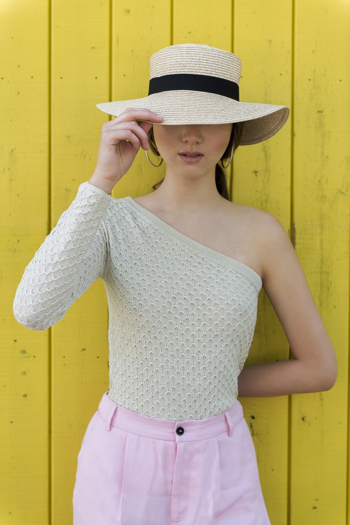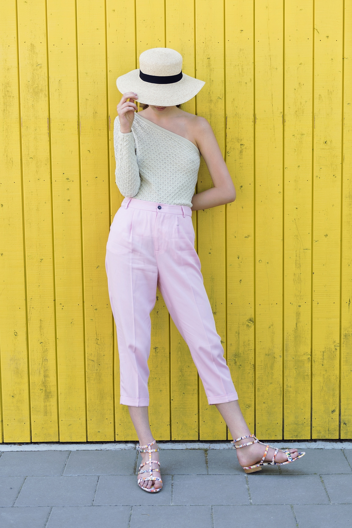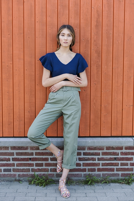 Our next look, is for the ones who love to play with colors in summer. You can mix this knitwear asymmetric top with some pastel color pants to give it that pop of color to the outfit. Accessorize it with a cool straw hat, or maybe add some cool sunglasses, it’s up to you!