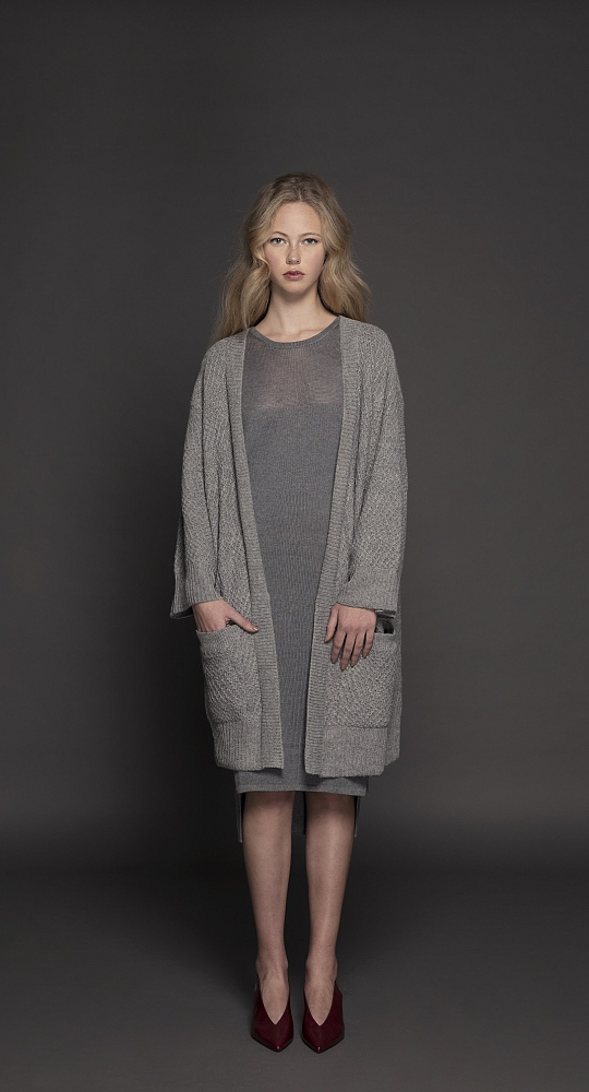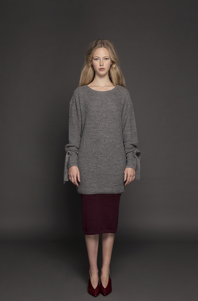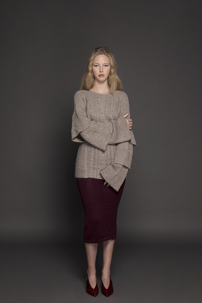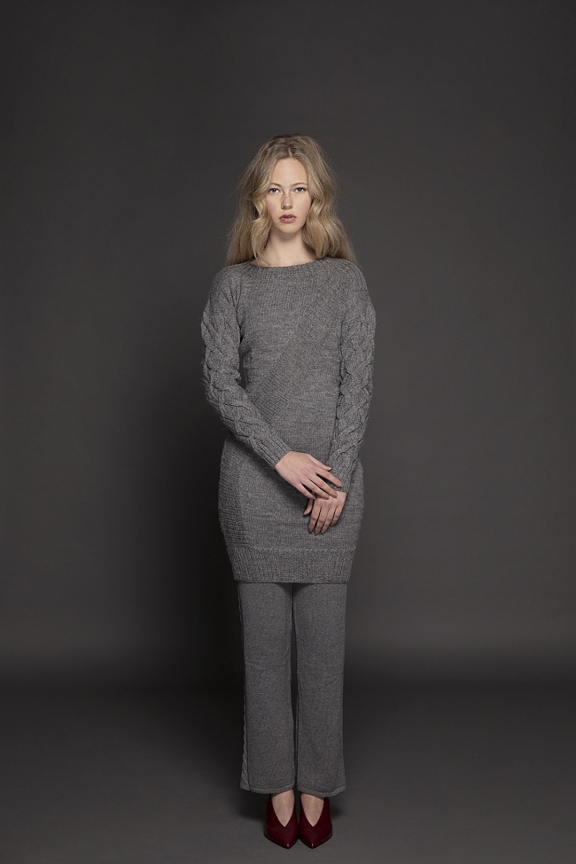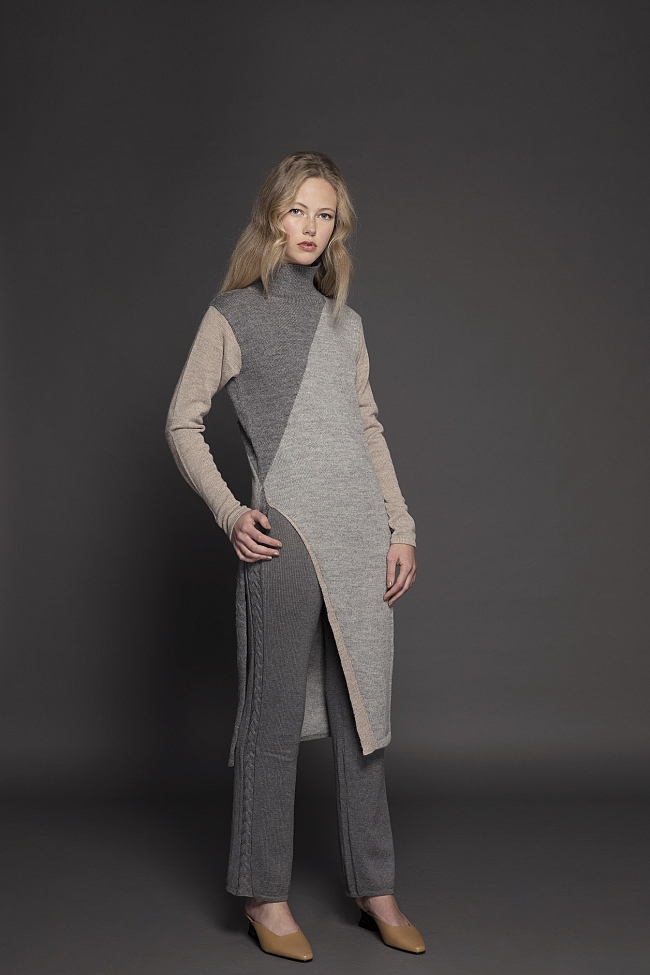 The color palette is neutral and atemporal having tones of beige and a grey scale with accent of scarlet tone which make reference to the emotions, the knots, the arteries. As for the knits, we have play with the cubism, having pieces with cuts created over Picasso masterpieces creating new forms and shapes. In addition, we have play with stitches direction and variation.