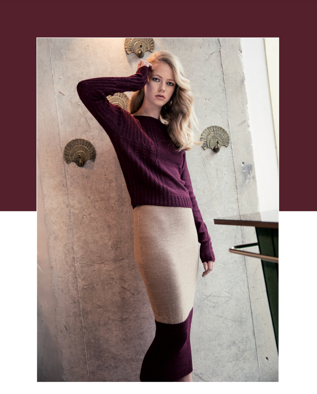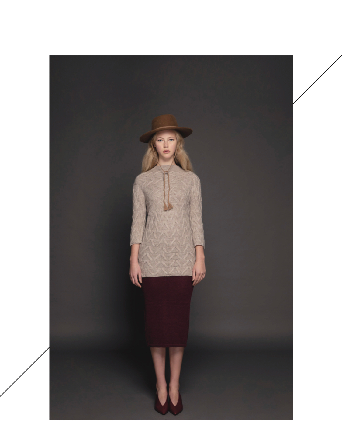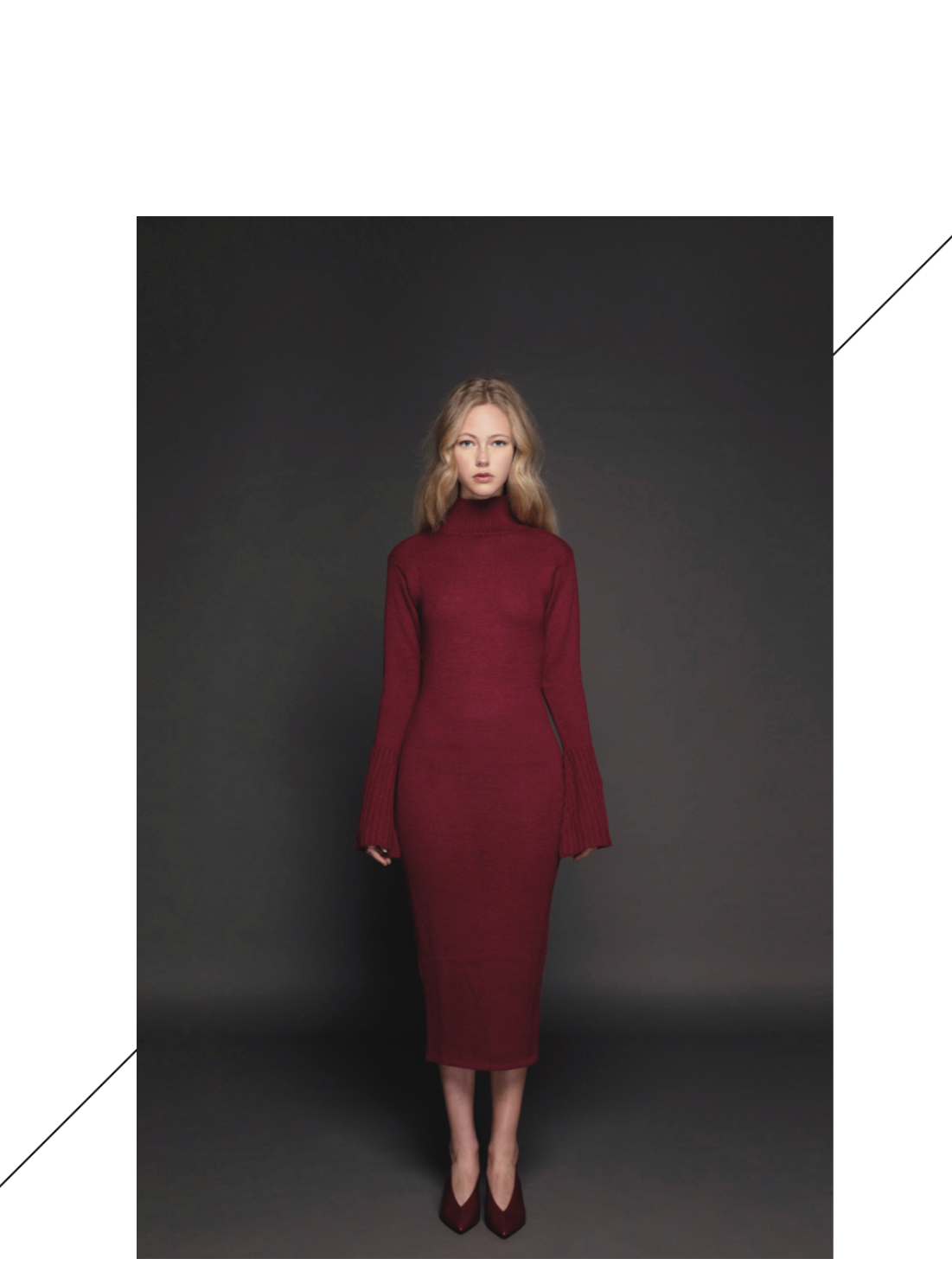 The color palette is neutral and atemporal having tones of beige and a grey scale with accent of scarlet tone which make reference to the emotions, the knots, the arteries. As for the knits, we have play with the cubism, having pieces with cuts created over Picasso masterpieces creating new forms and shapes. In addition, we have play with stitches direction and variation.